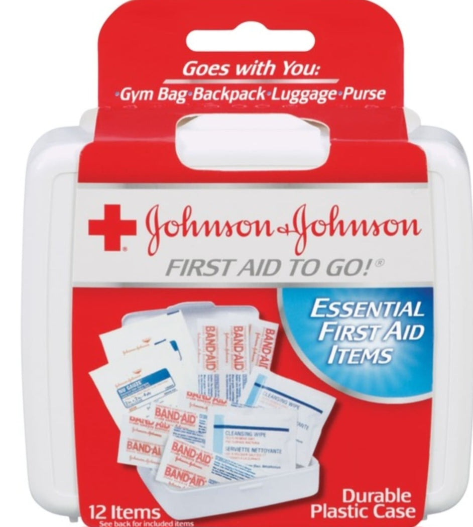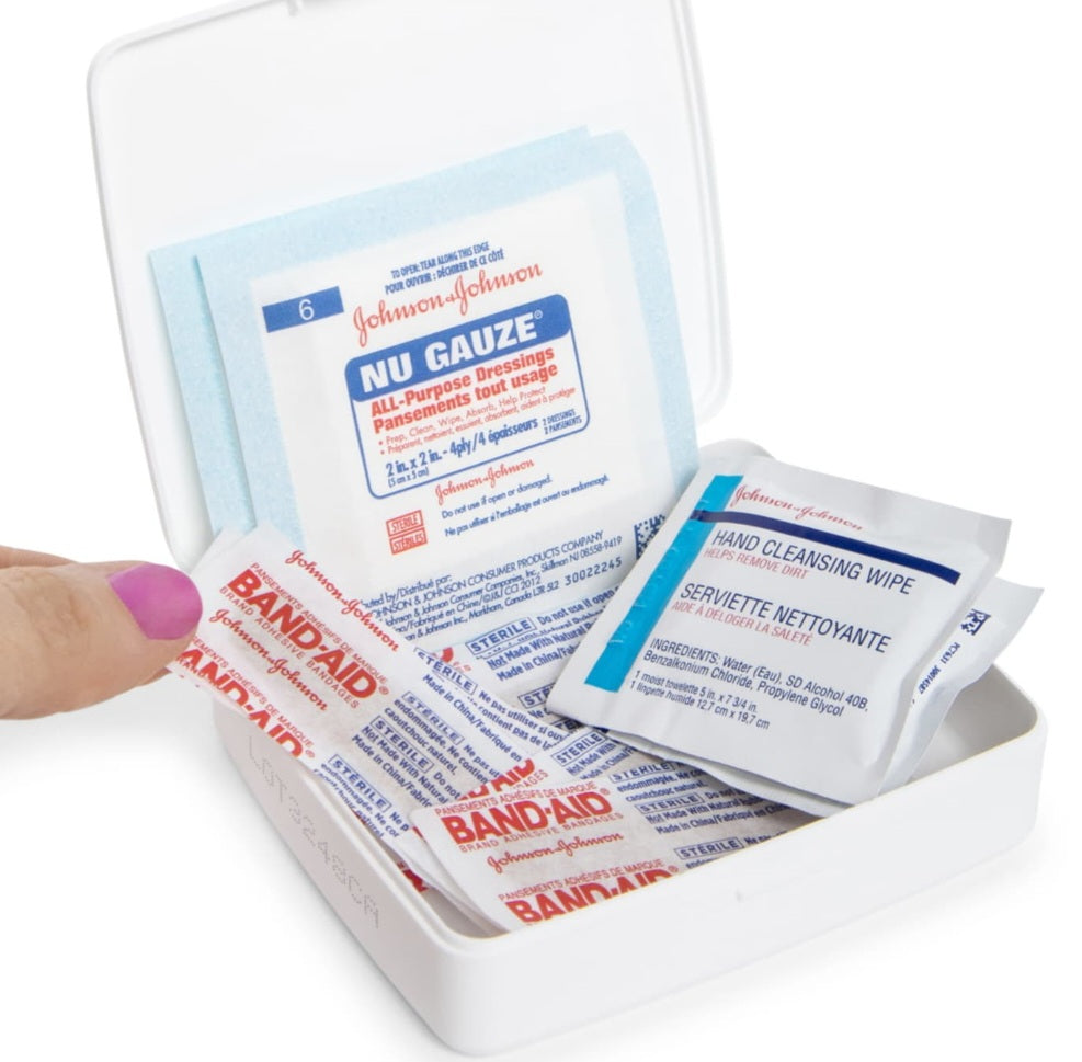 - included: 2 hand cleansing wipes, 4 gauze pads, 2 band-aid® flexible fabric adhesive bandages (3/4in x 3in), 4 band-aid® flexible fabric adhesive bandages (5/8in x 2 1/4in), 1 durable plastic case