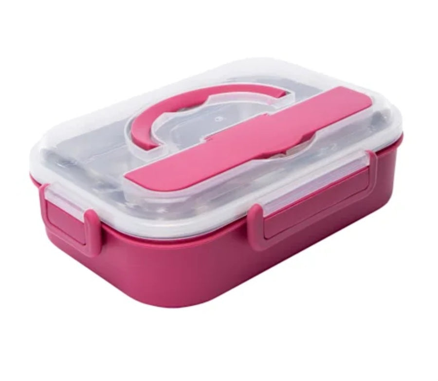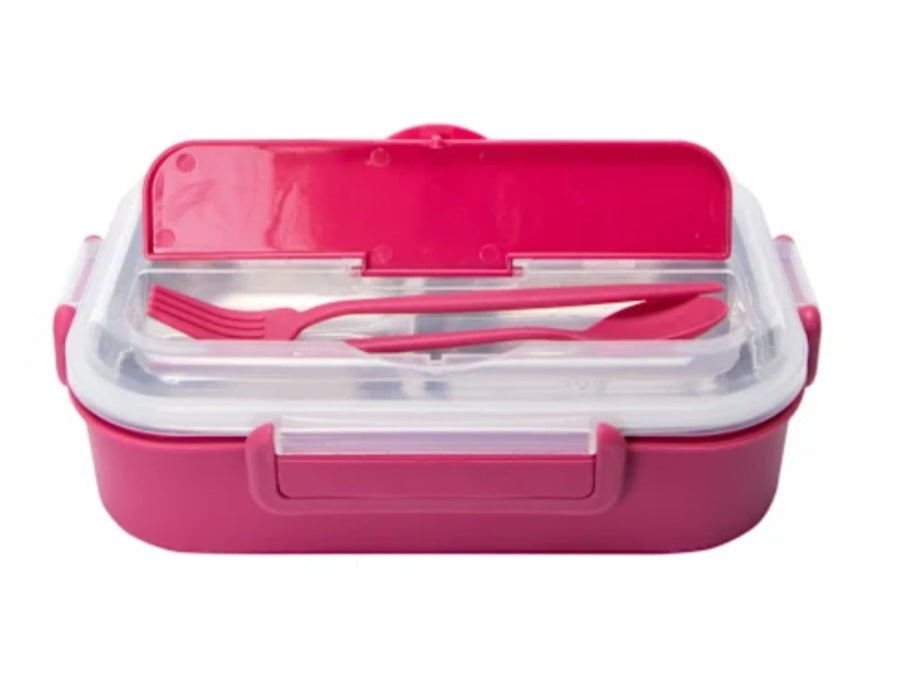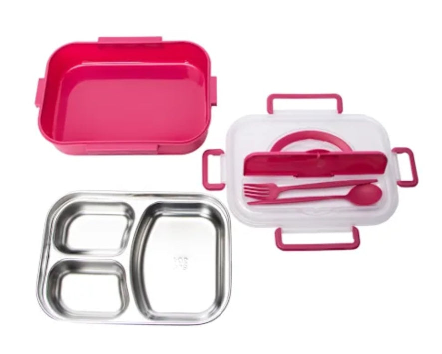 Includes 1 stainless steel bento box, 1 fork, 1 spoon, 1 metal tray