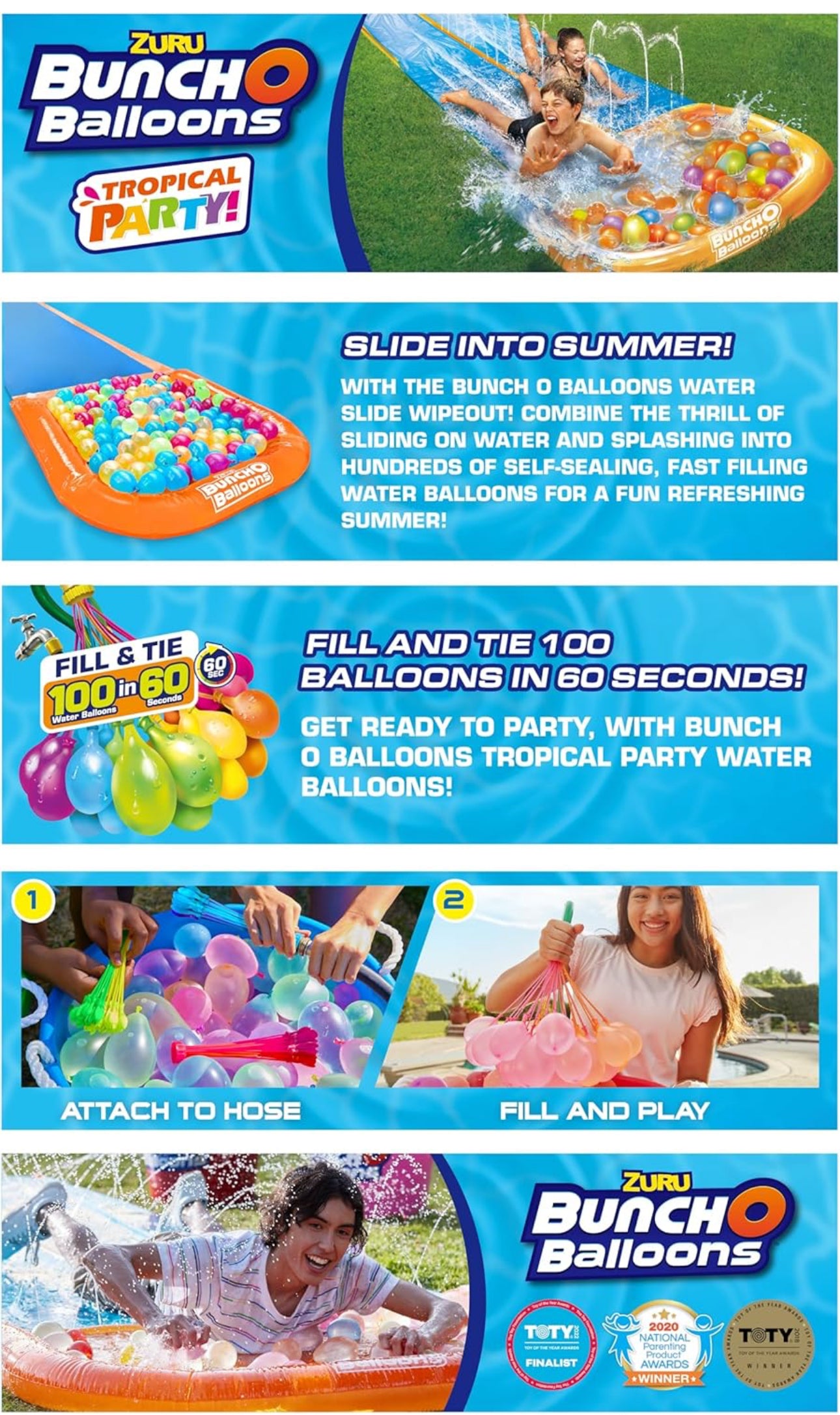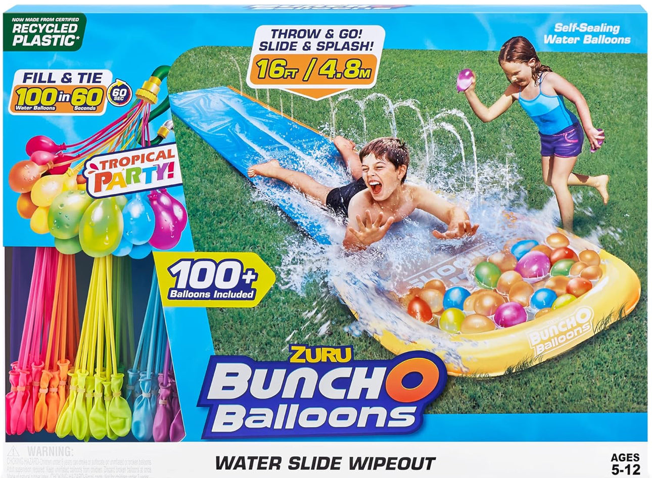 - Slide Into Summer: Combine the thrill of sliding on water and an epic water fight with the new Tropical Party Wipeout Water Slide! Slide into hundreds of self-sealing, fast-filling water balloons to have the perfect refreshing summer game!