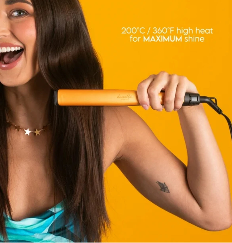 | A hair straightening flat iron created to nail your look every time! Danielle Creations 1 inch Ceramic Tourmaline Hair Straightening Flat Iron is the go-to for perfectly straight-sleek locks or loose curls, anywhere, anytime! A perfect match for all hair types, the ceramic and tourmaline coated plates help to preserve moisture, add luster and shine while achieving your desired look. L.E.D. power-on indicator and 390°F high heat for maximum shine. Danielle Creations 1" Ceramic Tourmaline Hair Straightening Flat Iron 390°F high heat for maximum shine Fast heat-up On/off switch L.E.D. power-on indicator |