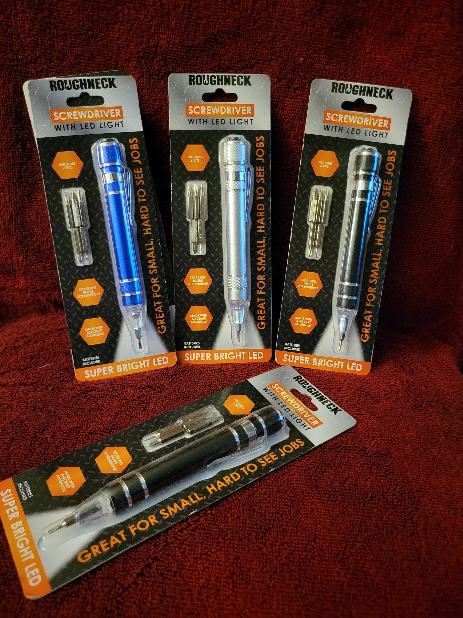 Great for small, hard to see jobs. Includes 6 bits. Store bits inside screwdriver. Made with aircraft aluminum.