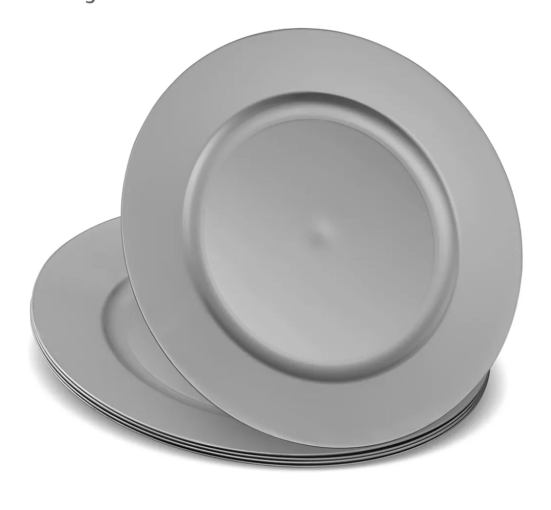 These 13 inch silver party charger plates are elegant and sophisticated, perfect for all your hosting. Made with high quality disposable plastic these chargers have the option of both single use or reusable. Plastic chargers are ideal for easy cleanup after parties. Use for all your events and hosting, for parties big and small. Pack of 6